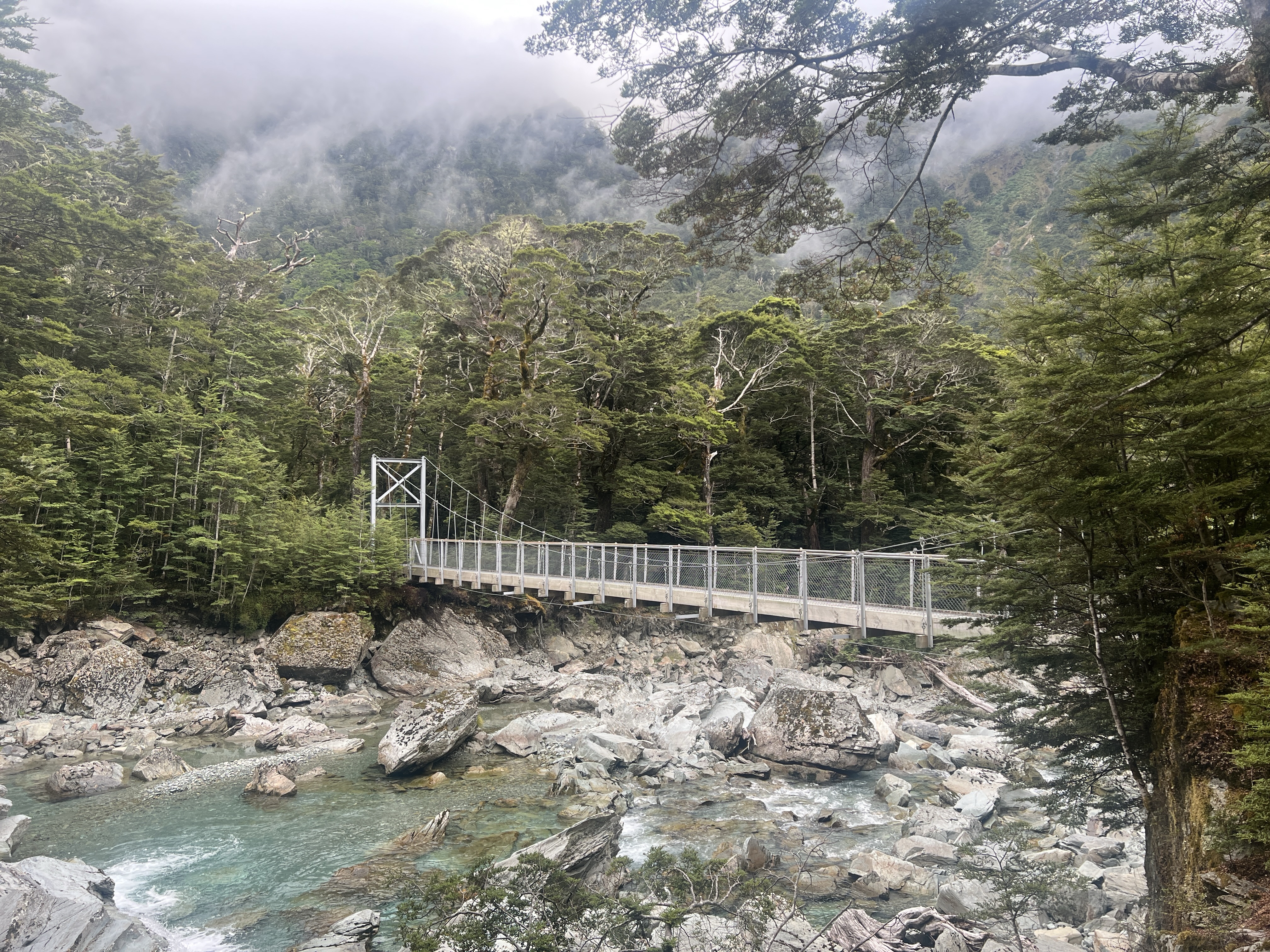 Après 3 heures 20 de marche, 10 km parcourus et 700 m de dénivelé positif, nous atteignons notre objectif : la Falls Hut. Et quelle récompense ! La vue est à couper le souffle, entre montagnes majestueuses et cascades vertigineuses. Peu importe combien de randonnées je fais ici, la Nouvelle-Zélande ne cesse jamais de m’émerveiller.